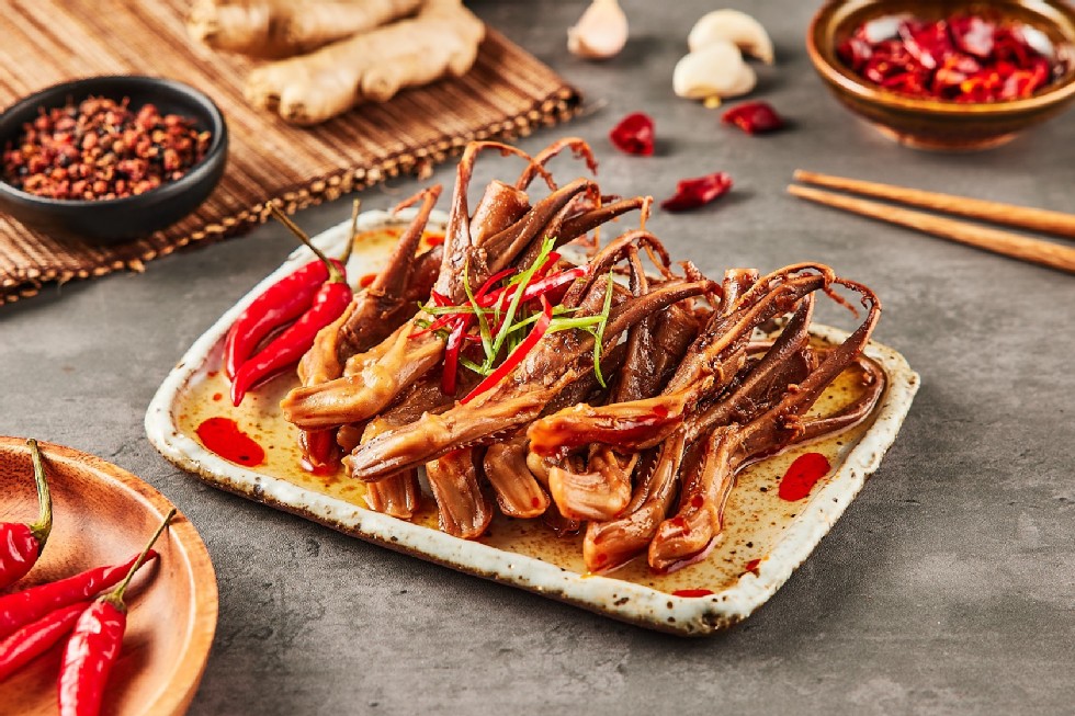 成 份:鴨舌頭、中藥材(桂尖、小茴、川芎、丁香、八角) 、醬油、糖、鹽、辣椒、花椒、胡椒 .品質改良劑(醋酸鈉)