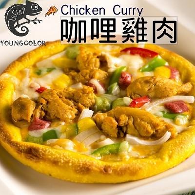 咖哩雞肉-披薩皮(麵粉、沙拉油、鹽、糖、酵母粉、薑黃粉)、雞肉、乳酪絲、咖哩醬、三色乳酪(乳酪絲、菠菜粉、薑黃粉、紅麴粉)、青椒、洋蔥)