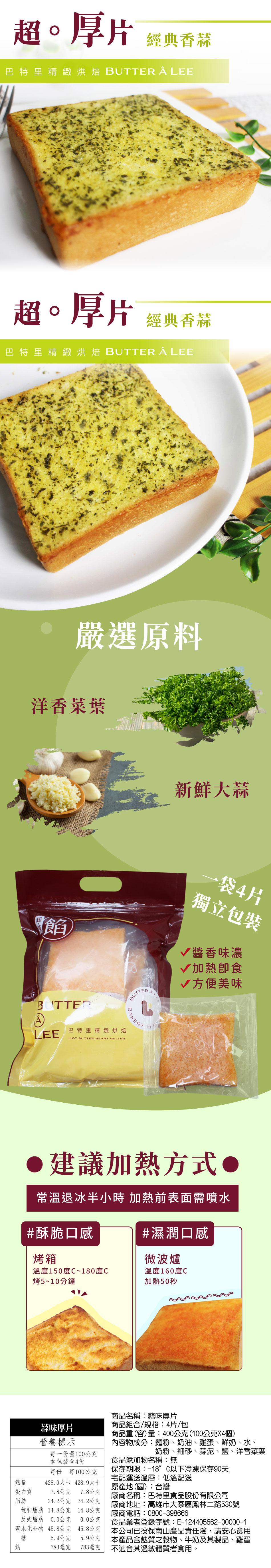 商品說明 產品名稱:滿餡超厚片法式香蒜口味規 格:400g /包,4片/包製造日期:如包裝所示保存期限:冷凍3個月(以消費者收受日算起,至少距有效期限剩餘總效期的1/2以上)成 份:麵粉、奶油、雞蛋、鮮奶、水、奶粉、細砂、蒜泥、鹽、洋香菜葉產品特色:覆熱回烤,即可享受美、經典香蒜 濃郁香蒜醬料