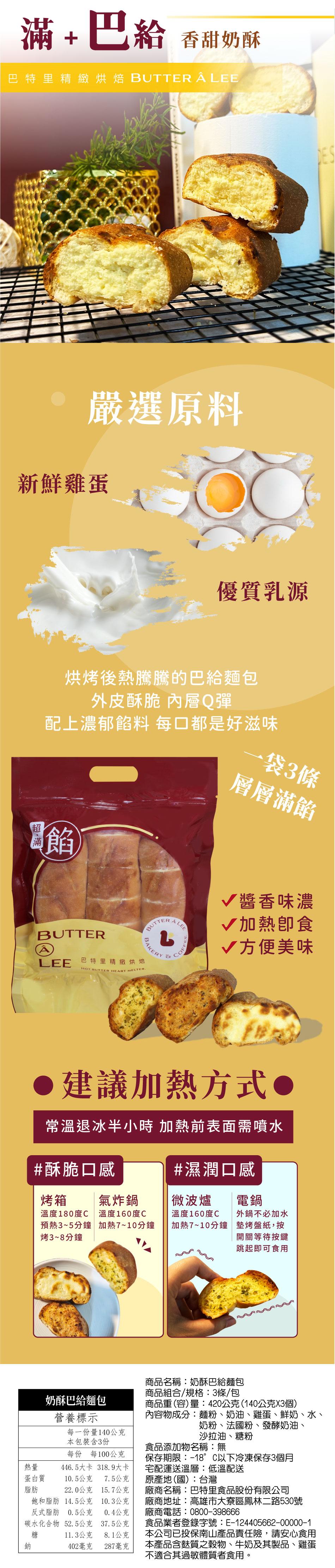 商品說明 產品名稱:滿餡法國巴給-濃奶酥規 格:420g /包,3條/包製造日期:如包裝所示保存期限:冷凍3個月(以消費者收受日算起,至少距有效期限剩餘總效期的1/2以上)成 份:麵粉、奶油、雞蛋、鮮奶、水、奶粉、法國粉、發酵奶油、沙拉油、糖粉產品特色:覆熱回烤,即可享受美、香甜奶酥 甜甜奶香 甜而不膩