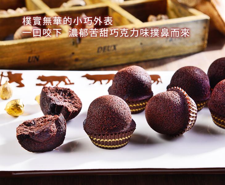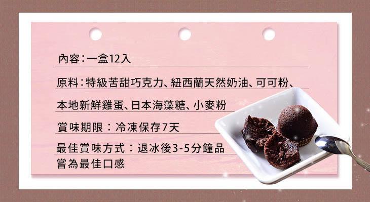 產品特色:30年老師傅使用五種以上進口高級巧克力調製而成的黃金比例,略帶苦甜而不膩口,讓您一口接一口的幸福甜點。