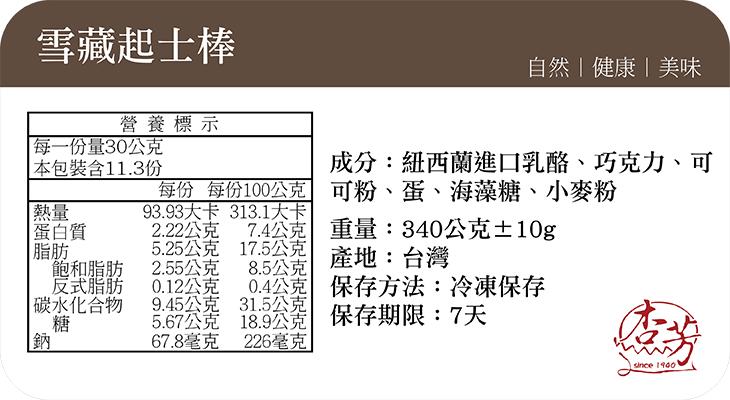 商品說明 產品名稱:雪藏起士棒(3入)規 格:340g±10g製造日期:接單後生產保存期限:冷凍保存7天成 份:紐西蘭進口乳酪、巧克力、可可粉、蛋、海藻糖、小麥粉產 地:台灣最佳賞味方式:退冰後3-5分鐘品嘗為最佳口感
