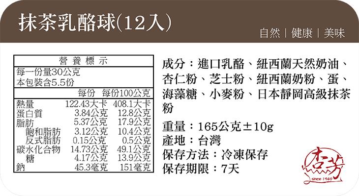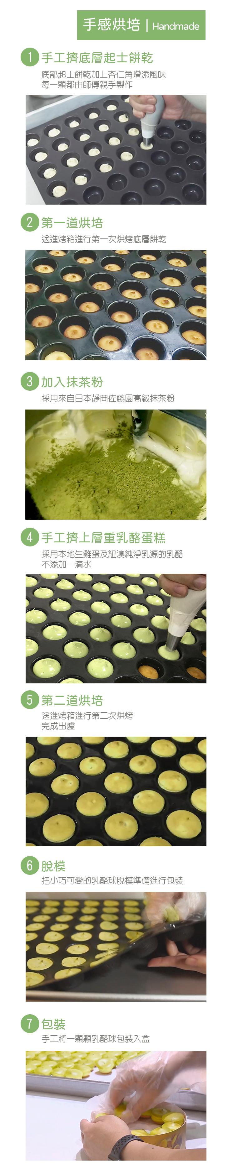 成 份:進口乳酪、紐西蘭天然奶油、杏仁粉、芝士粉、紐西蘭奶粉、蛋、海藻糖、小麥粉、日本靜岡高級抹茶粉