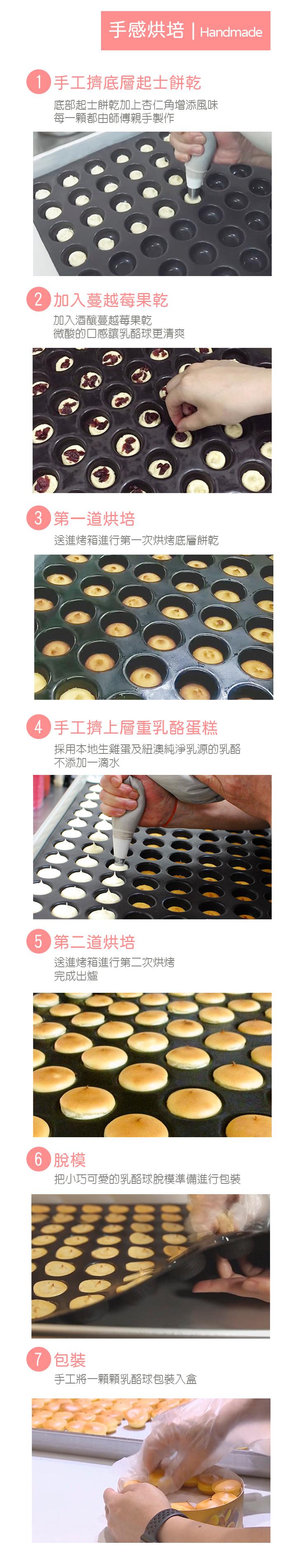 乳酪球採用來自最天然的紐西蘭乳酪,重乳酪蛋糕加上底部手工餅乾, 需經過兩道烘培手工製作 ,手工製作雖費時,老師傅的堅持就是要給您最美味的味道!