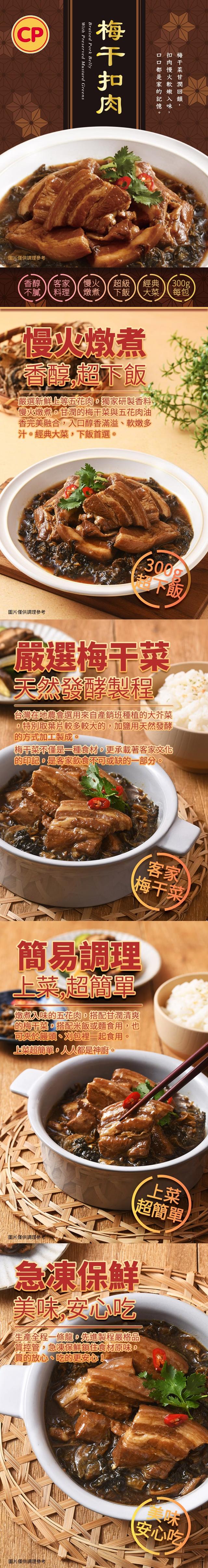 商品說明 商品名稱:梅干扣肉規 格:300g±10%/包成 分:依各包裝所示產 地:台灣保存期限:冷凍1年(以消費者收受日算起,至少距有效日期前180日以上)產品特色:• 嚴選上等五花肉、梅干菜• 獨家製程,慢火燉煮入味•免排隊,在家享用經典大菜•入口醇香滿溢、軟嫩多汁•家庭料理、小資獨享、商業簡餐•露營車宿,三餐主食宵夜良伴•可搭配米飯、麵、饅頭、刈包食用•全熟冷凍品