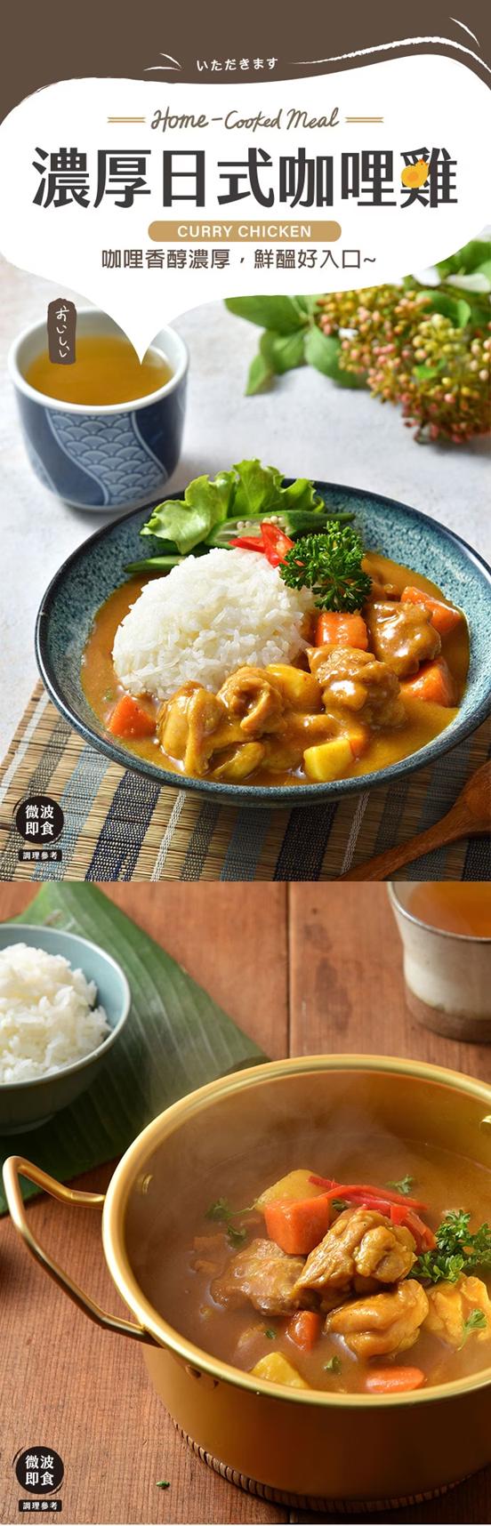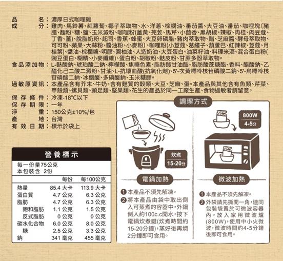 商品說明 商品名稱:濃厚日式咖哩雞規 格:150g/包成 分:依各包裝所示產 地:台灣保存期限:冷凍1年(以消費者收受日算起,至少距有效日期前180日以上)產品特色:.美味調理包,鮮食廚房私房菜.全熟冷凍品,覆熱即食