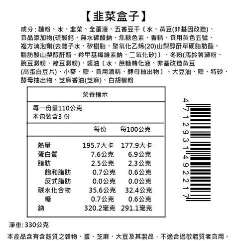 成 分:麵粉、水、韭菜、全蛋液、五香豆干、冬粉、醬油、大豆油、鹽、特砂、酵母抽出物、芝麻香油、白胡椒粉