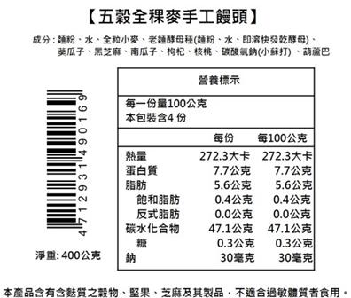 成 分:麵粉、水、全稞粒粉、老麵酵母種(麵粉、水、即溶快發乾酵母)、葵瓜子、黑芝麻、南瓜子、枸杞、核桃、碳酸氫鈉(小蘇打) 、葫蘆巴