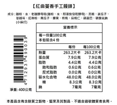 成 分:麵粉、水、老麵酵母種(麵粉、水、即溶快發乾酵母)、黑糖、葵瓜子、蔓越莓、紅麴粉、南瓜子、腰果、核桃、扁桃仁、葫蘆巴、碳酸氫鈉(小蘇打)