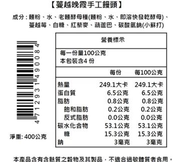 成 分:麵粉、水、老麵酵母種(麵粉、水、即溶快發乾酵母)、蔓越莓、糖、 紅藜麥、葫蘆巴、碳酸氫鈉(小蘇打)