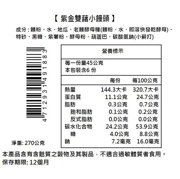 成 分:麵粉、水、地瓜、老麵酵母種(麵粉水即溶快發乾酵母)、特砂、黑糖、紫薯粉、酵母粉、葫蘆巴、碳酸氫鈉(小蘇打)