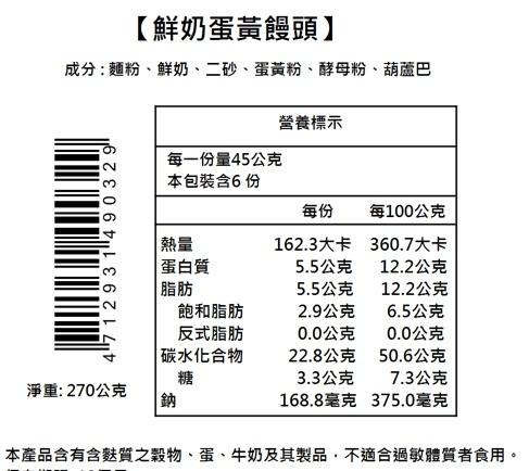 成 份:麵粉、鮮奶、二砂、蛋黃粉、酵母粉、葫蘆巴
