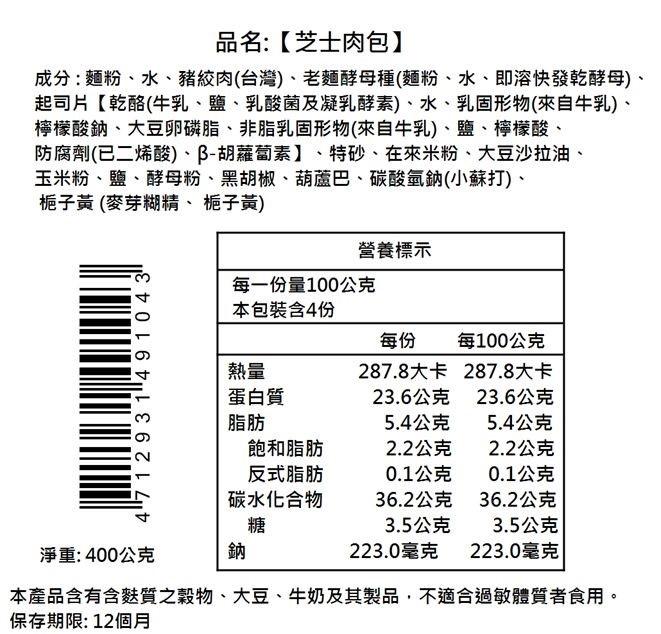 成 分:麵粉、水、豬絞肉(台灣) 、老麵酵母種(麵粉、水、即溶快發乾酵母)、起司片、特砂、大豆沙拉油、鹽、酵母粉、黑胡椒、葫蘆巴、碳酸氫鈉(小蘇打)