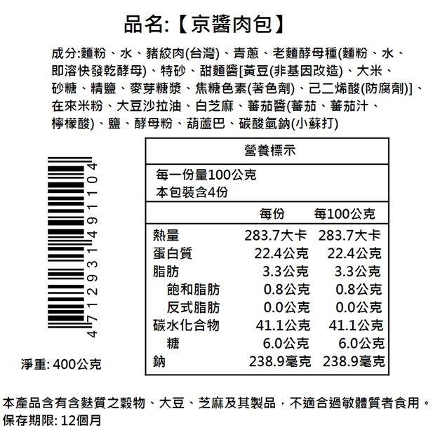 成 分:麵粉、水、豬絞肉(台灣)、青蔥、老麵酵母種(麵粉、水、即溶快發乾酵母)、特砂、甜麵醬[黃豆(非基因改造)、大米、砂糖、精鹽、麥芽糖漿、焦糖色素(著色劑)、己二烯酸(防腐劑)]、在來米粉、大豆沙拉油、白芝麻、蕃茄醬(蕃茄、蕃茄汁、檸檬酸)、鹽、酵母粉、葫蘆巴、碳酸氫鈉(小蘇打)