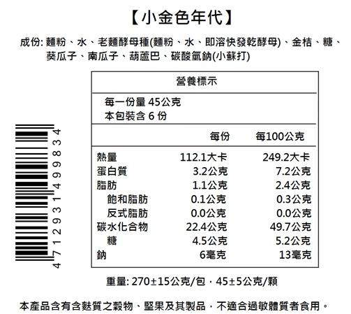 過敏原資訊 : 本產品含有含麩質之穀物、堅果及其製品、不適合過敏體質者食用。