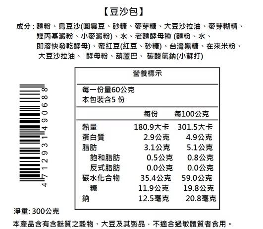 成 份:麵粉、烏豆沙、水、老麵酵母種(麵粉、水、即溶快發乾酵母)、紅豆沙、蜜紅豆、台灣黑糖、在來米粉、大豆沙拉油、酵母粉、葫蘆巴、碳酸氫鈉(小蘇打)