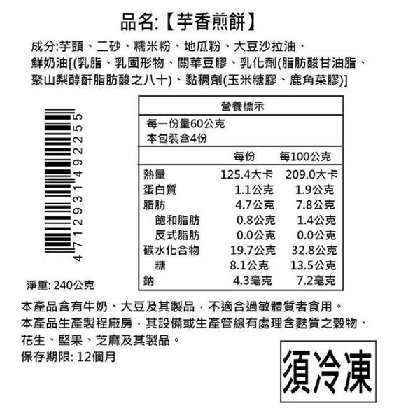 成 份:芋頭、二砂、糯米粉、地瓜粉、大豆沙拉油、鮮奶油[(乳脂、乳固形物、關華豆膠、乳化劑(脂肪酸甘油脂、聚山梨醇酐脂肪酸之八十)、黏稠劑(玉米糖膠、鹿角菜膠)]
