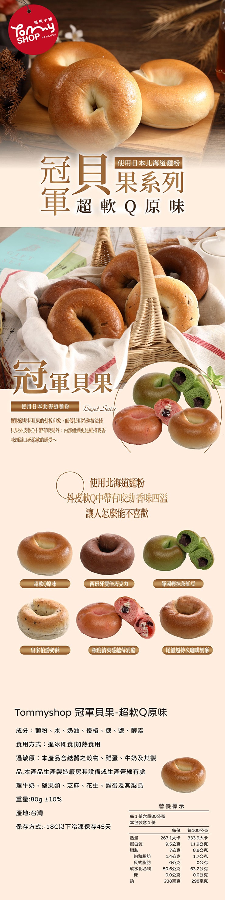 商品說明 商品名稱:【Tommyshop】冠軍貝果-超軟Q原味規 格:80g±10%成 份:麵粉、水、奶油、優格、糖、鹽、酵素產 地:台灣保存期限:-18度C以下冷凍保存45天 商品特色:使用100%北海道麵粉口感細緻Q彈外皮軟Q帶勁香味四溢濃郁麥香 注意事項:過敏原資訊:本產品含麩質之穀物、雞蛋、牛奶及其製品,本產品生產製造廠房其設備或生產管線有處理牛奶、堅果類、芝麻、花生、雞蛋及其製品