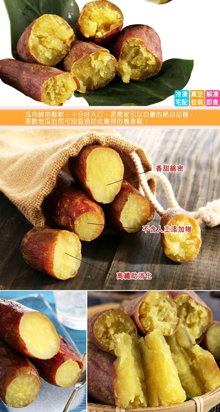 商品說明 產品名稱:【綠之醇】台灣金時冰烤地瓜規 格:400g±10%/包(約2-3條)製造日期:標示於袋上保存期限:冷凍-18℃以下365天成 份:甘藷產 地:台灣產品特色:台灣生產之金時地瓜皮為紫色,肉為黃色,口感綿密甘甜的味道,金時地瓜富含維生素C、鈣、胡蘿蔔素,口感較一般地瓜Q、扎實、甜度高,皮薄養分多,建議食用時連皮一起吃! 注意事項:◎包裝拆封後,請儘速使用完畢,避免食材變質。◎圖和實品因拍攝或略有差異,以廠商出貨為主。◎若發生產品缺貨,客服人員將在出貨前與您連絡。◎製造日期與有效期限,商品成份標示於袋上。