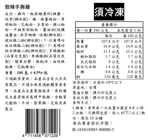 成 份:雞肉、椒麻醃漬料(碘鹽、味素(調味劑)、糖、樹薯澱粉、黑胡椒粉、花椒粉、五香粉、雞心椒粉、中粗黑胡椒粒、醬油粉(純醸造醬油、麥芽糊精、味精(調味劑)、琥珀酸二鈉(調味劑)、5’-次黃嘌呤核甘磷酸二鈉(調味劑)、5'-鳥嘌呤核甘磷酸二鈉(調味劑))、多磷酸鈉(品質改良劑)、焦磷酸鈉(品質改良劑)、關華豆膠、辣椒碎、油性辣椒精、花椒精油)