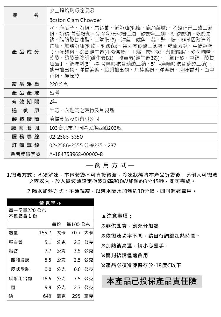 波士頓蛤蜊巧達濃湯過敏源資訊:牛奶、小麥及其製品,詳請參見營養標示
