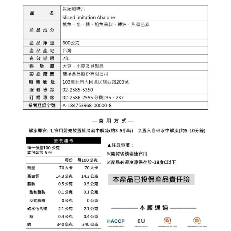 商品說明 產品名稱:貴妃鮑味片規 格:600g±/包製造日期:依包裝說明保存期限:冷凍-18℃以下約2年成 份:依營養標示說明產品特色:精選魷魚切片製成,新鮮滑嫩及鮮美肥厚具咀嚼的口感,彷彿品嘗真正的鮑魚,讓人一口接一口,口口皆滿足。 注意事項:過敏源資訊:大豆、小麥及其製品,詳請參見營養標示