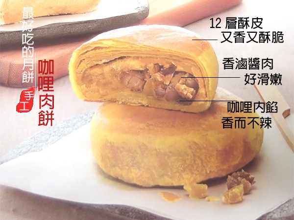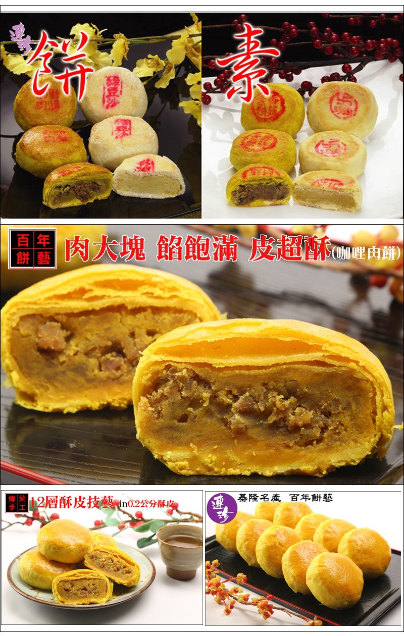 商品說明 產品名稱:咖哩餅8入裝(葷食)規 格:每入60 g,8入裝製造日期:接單後生產保存期限:常溫保存20天(到貨日起算為第一天)成 份:咖哩餡餅肉大塊餡飽滿皮超酥更是廣大客戶指定 中秋必買的送禮佳品產品特色:連珍月餅中之餅后 採用本店獨家調配綠豆餡 咬上一口濃濃綠豆純味在口中爆開 心涼脾胃大開 中秋節吃月餅 就一定要吃這一味!!