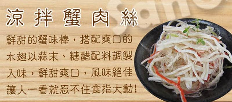 商品說明 商品名稱:【老爸ㄟ廚房】涼拌蟹肉絲規 格:150g±4.5%/包成 分:蟹肉棒、水翅、芹菜、L-麩酸鈉 、紅蘿蔔、辣椒、香油、鹽產 地:台灣保存期限:冷凍1年(以消費者收受日算起,至少距有效日期前180日以上)產品特色:各式涼拌小菜一次滿足小酌、聚餐、野餐必備方便好攜帶,口感美味 注意事項:過敏原資訊:本產品含有蟹類.L-麩酸鈉及其製品.不適合過敏者體質食用