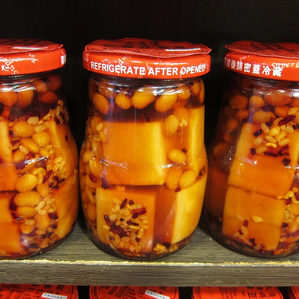 {旁邊有含豆類的豆腐乳(原味、紅麴、微辣 豆腐乳),在醬汁還呈較透明的時候就是還沒完全發酵完成,到醬汁呈深色時就是風味成熟了。}