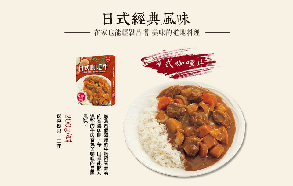 產品特色:燉煮四個鐘頭的牛腩附著滿滿的香濃咖哩,每一口都能吃到濃郁的牛肉香氣與咖哩的異國風味,絕佳的搭配請一定要細細品嘗這令人激賞的美味。
