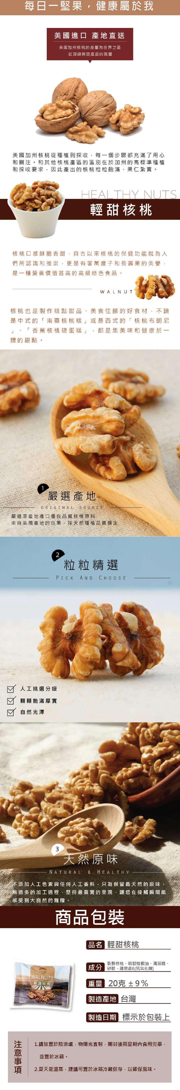商品說明 產品名稱:輕甜核桃規 格:20G+_9%/包有效日期:依包裝袋標示保存期限:常溫10個月(以消費者收受日算起,至少距有效期限剩餘總效期的1/3以上)成 份:核桃、精製棕櫚油、糖、維他命E(抗氧化劑)產品特色:採用低溫真空乾燥,保留全部的營養價值外,嚐起來更香脆可口,簡單自然的加工過程,讓堅果的味道真實呈現,添加多種果乾,口感更加豐富多層次,小小果仁帶給你大大營養,是你零食的最佳選擇喔!