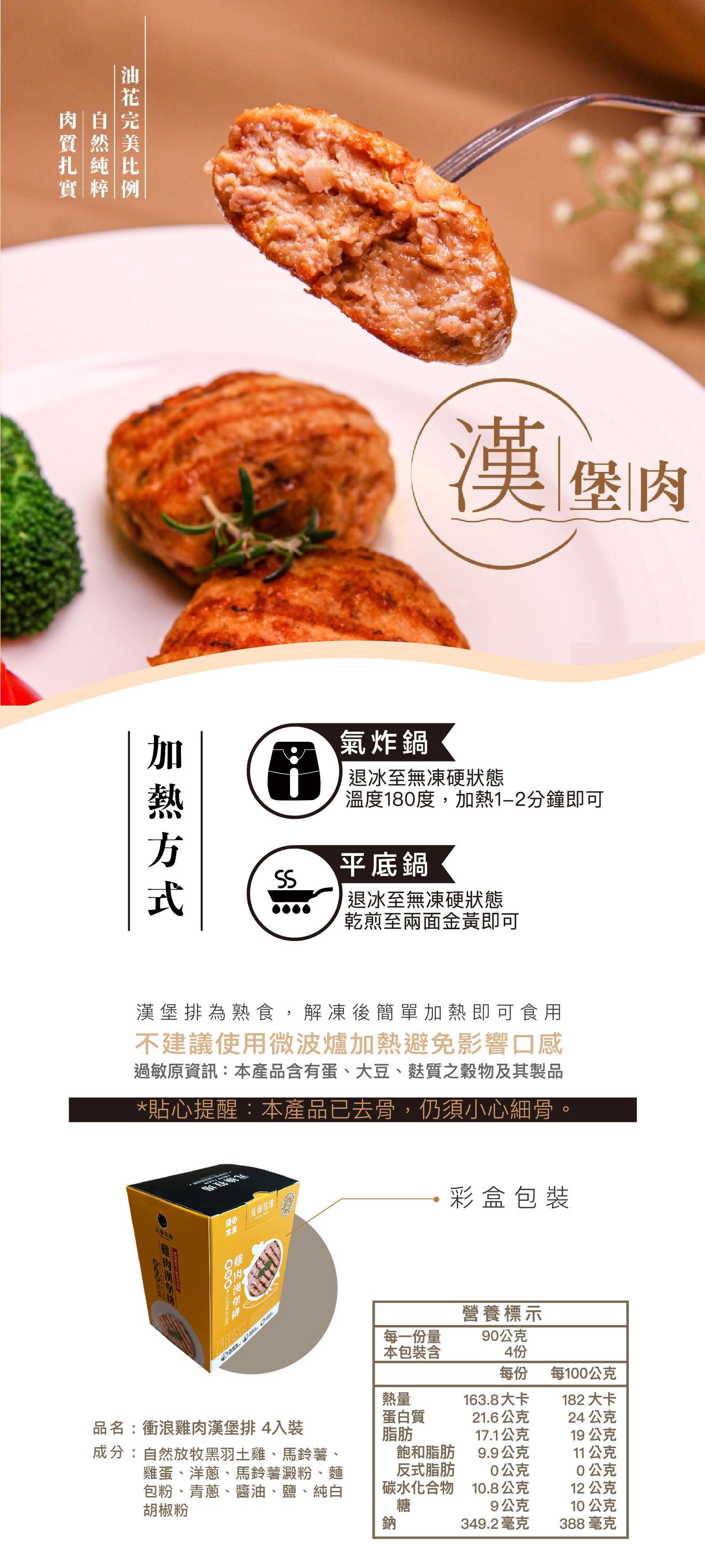 商品說明 產品名稱:《快速料理》衝浪雞漢堡排 (土雞) /4入盒裝 (90g/片)規 格:360g製造日期:接單生產保存期限:負18度C冷凍保存一年成 份:自然放牧黑羽土雞、馬鈴薯、雞蛋、洋蔥、馬鈴薯澱粉、麵包粉、青蔥、醬油、鹽、純白胡椒粉產品特色:一般家庭/1-2人✓油花完美比例,肉質扎實軟嫩。✓嚴選16週黑羽土雞雞胸製作,低脂高蛋白✓無人工添加物✓熟齡土雞:嚴選16週以上自然放牧黑羽土雞(放山雞),久燉不柴、肉質緊實Q彈、低脂高蛋白✓保證新鮮衛生:全程低溫清洗分切,並真空包裝後急速冷凍,有效降低細菌滋生,再透過低溫宅配,確保雞肉品質✓簡單即食:真空包裝的即食料理,輕鬆即可上菜✓通過SGS與中央畜產會雙認證,無抗生素/無藥殘,健康無添加✓保存期限:負18度冷凍保存12個月,冷藏保存建議兩天內料理完畢 保存期限:-18度C冷凍保存一年