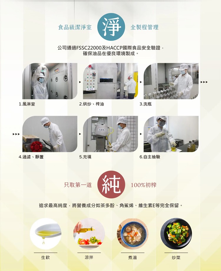 保存方法:請存放於陰涼處,勿置於火源高溫處,以免變質。開瓶後請儘速食用完畢,未食用完畢請置於冰箱冷藏保存。因油茶樹的品系、樹齡、天候造成茶籽成熟度差異,會影響茶油顏色。如有沉澱或雲霧狀,屬自然現象請安心食用。