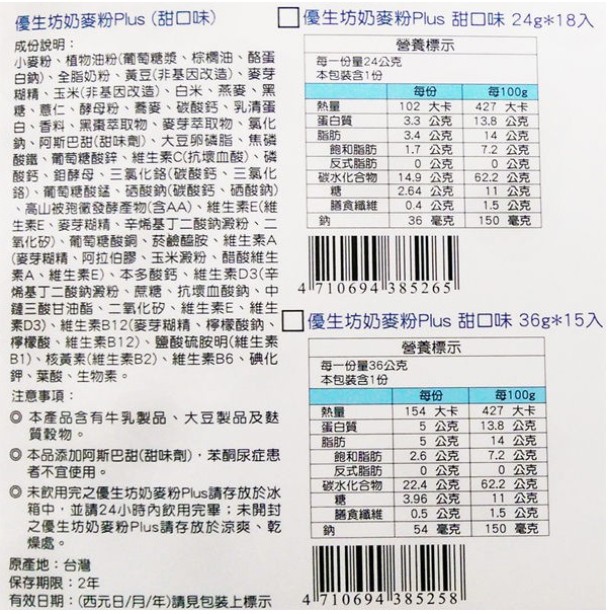 優生坊 奶麥粉 (36gx15包)/盒 適用於高齡咀嚼、吞嚥困難的長輩 限量:240份 原價$350 優惠 $319 分享 : 紅利回饋1% 小額免運 加入購物車 數量與品項 甜口味(36gx15包) 鹹口味(36gx15包) 原價$350 優惠$319 滿1000元免付運費80元 每筆訂單需要滿500元