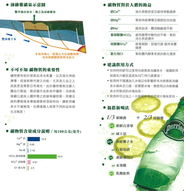其水源取自法國南方Vergee的Perrier泉水之下的岩石地層,