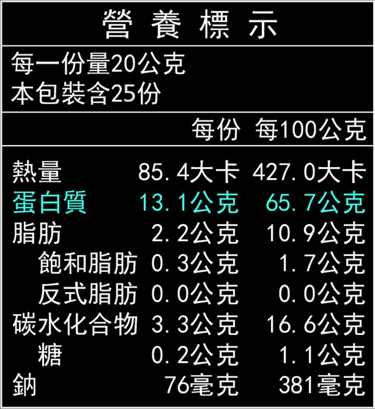 成份:黃豆(非基因改造)、大豆分離蛋白(含有大豆卵磷脂)。