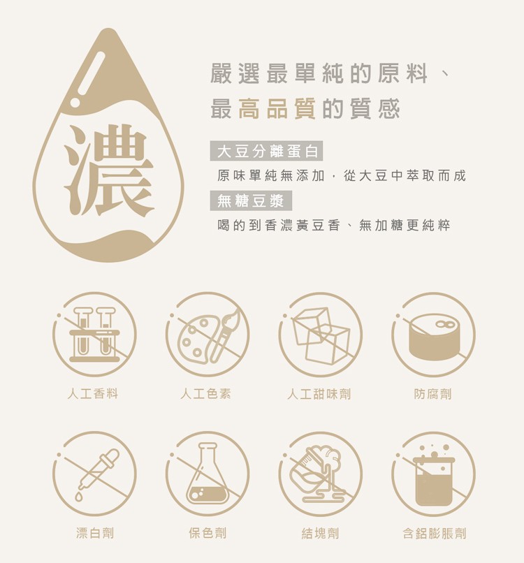 本產品特選非基因改造黃豆,經去皮和祛除胚芽,再焙炒、磨漿蒸煮、經殺菌滅酶處理去除抗營養與脹氣因子,有效降低普林含量,屬於低普林食品。