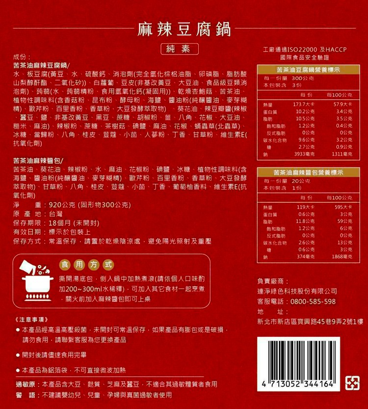 連淨-麻辣豆腐鍋 920g/袋 (全素)