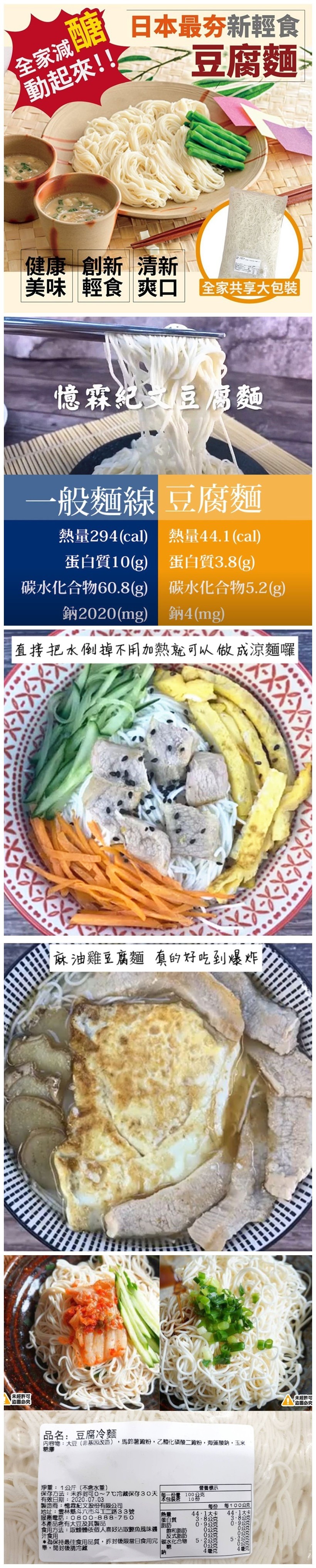 商品說明 日本最夯新輕食,健康減醣豆腐麵,低醣值、零澱粉,外觀很像麵線,但有非常大的不同!熱量約是一般麵線的6分之1,鈉含量更是約500分之1,採非基因改造黃豆製作,健康好吃,可以煮湯麵、乾麵、涼麵等各種料理方式都好吃~產地:台灣規格:1公斤+-10%成份:如圖片所示總效期:30天物流配送溫層: 冷藏 保存期限:保存冷凍-18℃以下一年