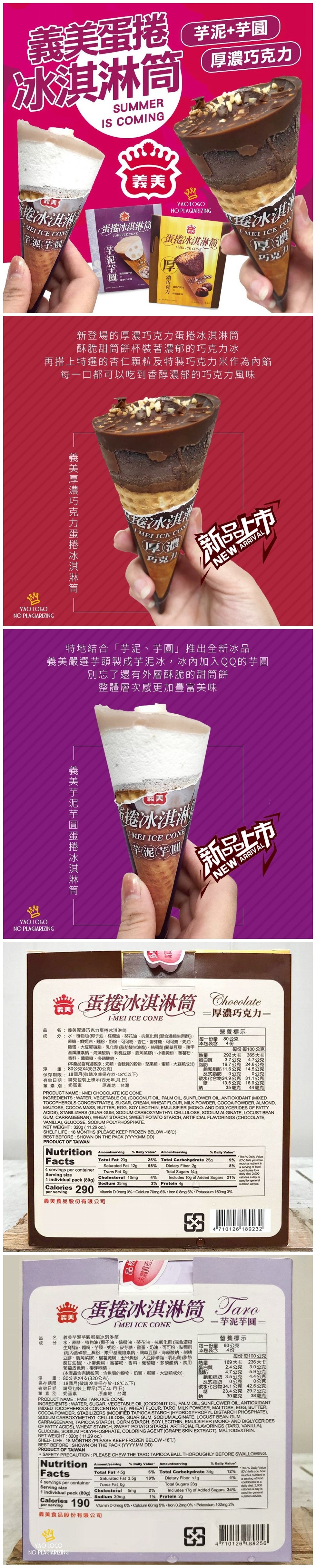 商品說明 愛吃冰品的朋友快來,義美新品這邊吃~夏日即將來臨,小編來推薦超好吃的蛋捲冰淇淋筒,除了原有的濃郁的巧克力口味,還有特別的芋泥芋圓口味吶~一定要來吃看看~!!👏新登場的厚濃巧克力蛋捲冰淇淋筒,酥脆甜筒餅杯裝著濃郁的巧克力冰,再搭上特選的杏仁顆粒及特製巧克力米作為內餡,每一口都可以吃到香醇濃郁的巧克力風味,實在是讓人忍不住要+1+1👏結合「芋泥、芋圓」推出全新冰品,芋頭控不多說直接+1先,在冰品中加「珍珠」是很夯的話題,邊吃冰還能增加咬的口感,義美嚴選芋頭製成芋泥冰,冰內加入QQ的芋圓,再加入外層酥脆的甜筒餅,整體層次感更加豐富美味吶~ 😋產地:台灣規格:一盒80g*4支入食用方式:開封即食溫層:冷凍保存方式:-18度保存期限:18個月口味:厚濃巧克力/芋泥芋圓