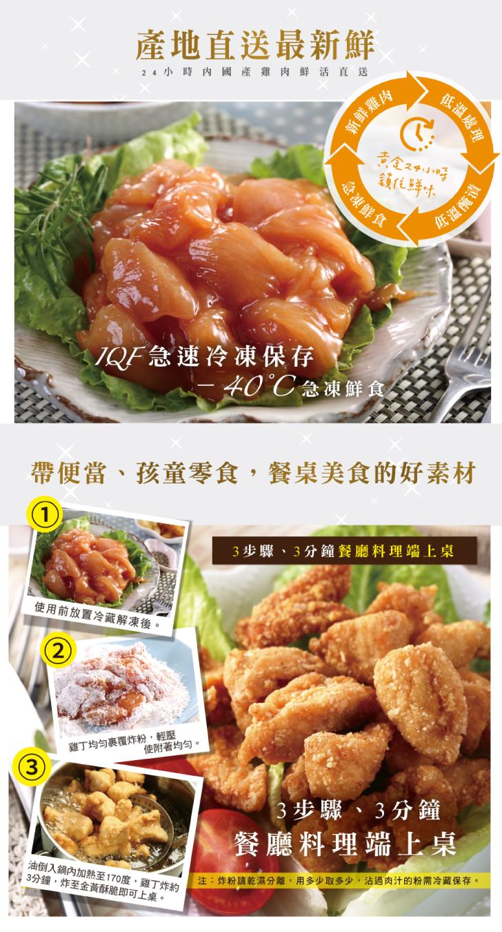 無骨雞丁,採用國產雞胸肉切丁並醃製,以急速冷凍來保持現宰肉品鮮嫩狀態。餐桌美食好夥伴。3步驟3分鐘,美食端上桌。