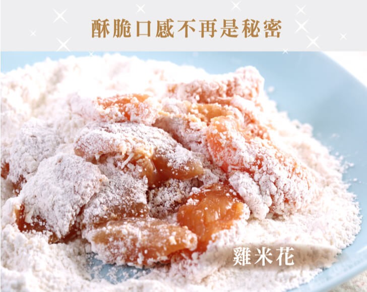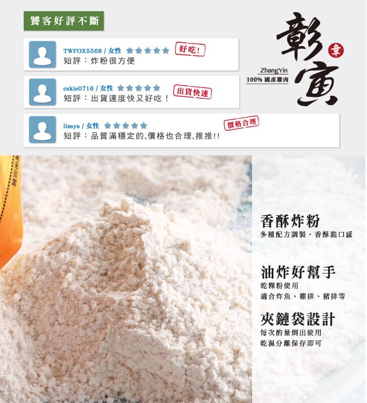 商品說明 香酥炸粉 注意事項:●.產品規格1.品名:香酥炸粉2.規格:250公克/包3.保存方法:每次酌量使用,乾溼分離保存,正常狀態下保存可保存3個月(日期標示於封口)4.本產品的包裝有夾鏈封口設計,未使用完畢的炸粉,務必封口按壓仔細再作保存。●.理念1.堅持品質:選用當日電宰廠CAS雞肉,確保食材鮮嫩 2.貨真價實:肉品選用高成本國產雞肉,非使用進口雞肉替代 3.童叟無欺:每個產品重量皆超過標示重量●.創意料理食譜:http://bit.ly/ZhangYin●.粉絲頁面私訊:https://goo.gl/YQEDTS●.粉絲頁面私訊[手機專用]:https://goo.gl/f9rAa2