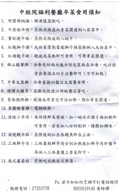 因團員要提早規劃,所以早早開團,中經院的製作數量不多,份量很足(約10人份),而且,除夕前一天拿到貨,可以放在室溫下解凍,不佔冰箱,除夕夜剛好可以上桌,已訂購者,只要在1/16結單前皆可更改中經院福利餐廳,由具有乙級執照主廚帶領具有丙級執照之廚師與多位廚師親自調配各式菜餚, 大餐廳的佳餚只要五分之一的價格即可帶回家取貨地點只有在和興路28巷9號5樓 年菜不含青菜
