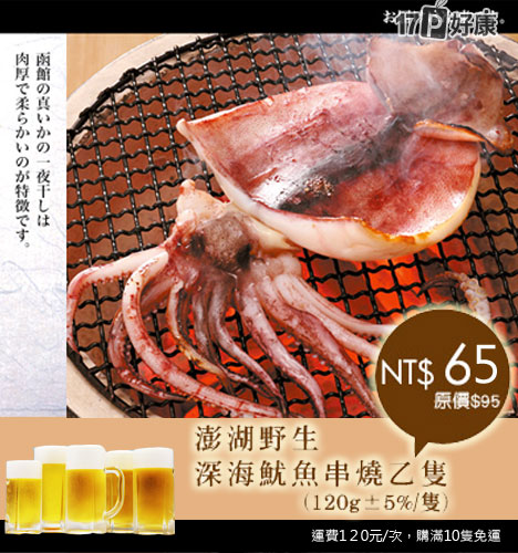 宅配:只要65元即可帶回【台北濱江】原價95元澎湖野生深海魷魚串燒乙隻(120g±5%/隻)。購滿10隻可享免運優惠