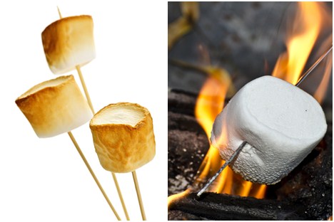 烤棉花糖 用竹籤串起,烤到表面呈現燒焦的金褐色,就可以享用焦香酥熱燙的烤棉花糖囉!
