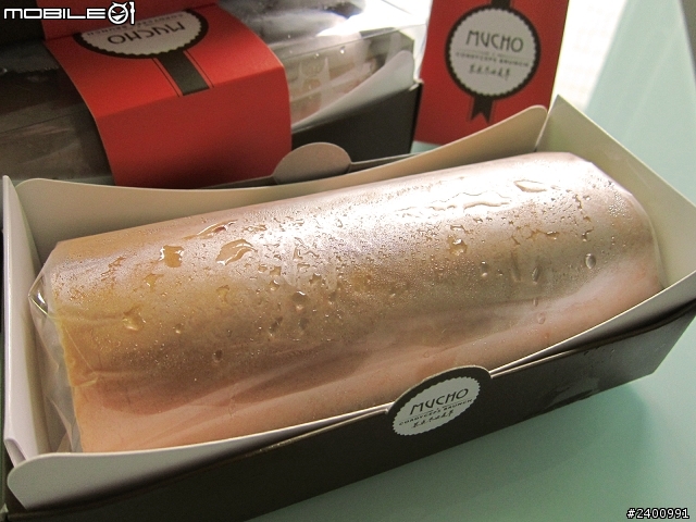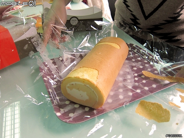 打開的過程有點麻煩......盒子不難拆,但是打開盒子之後大家都傻眼了,有層塑膠膜包著瑞士卷,而且還不是單純替它蓋被子而已,是像裹毛毯那樣整個包住啊!!!!打開包裝居然要把瑞士卷在手裡滾一圈啊!!!