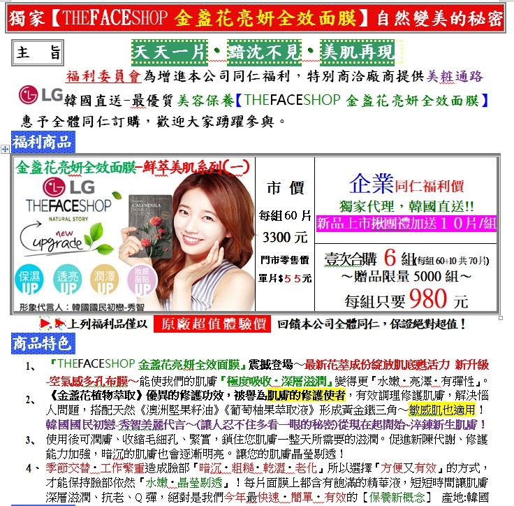 已流團 - 破盤下殺!!!國民初戀-秀智代言!!!THEFACESHOP金盞花亮妍全效面膜 |