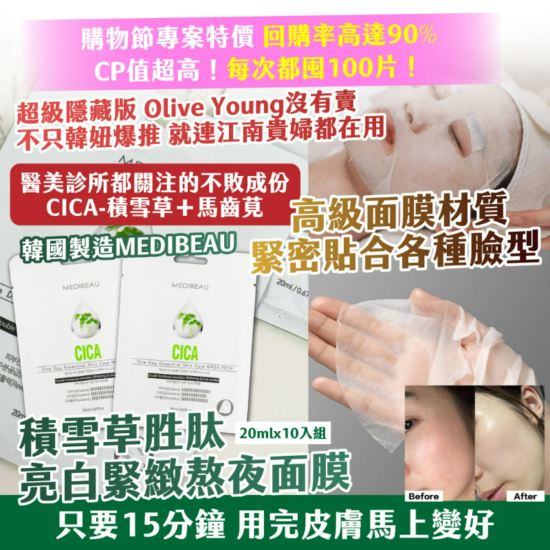 11/28(五)取貨~韓國製造|MEDIBEAU積雪草胜肽 亮白緊緻熬夜面膜 20mlx10入組(袋裝)   | [分享商店] 得速精緻百貨