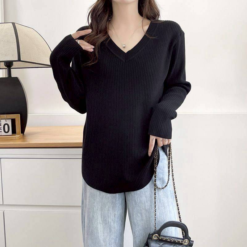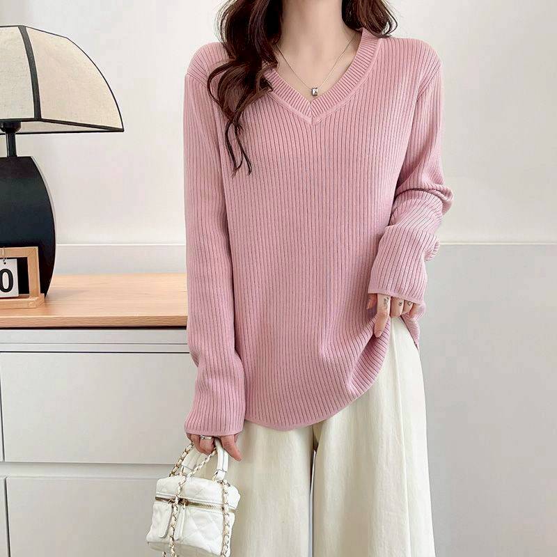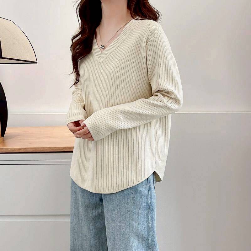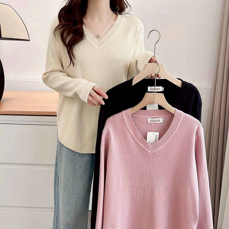 (韓組)V領長袖T恤內搭上衣弧形下擺顯瘦打底衫-黑-杏色-粉