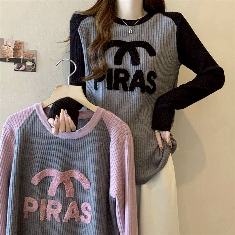 (韓組)大碼坑條撞色打底衫刺繡長袖上衣-粉-黑